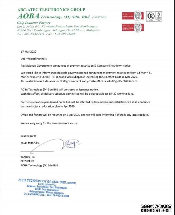 疫情影響!馬來(lái)西亞停工14天,電感、電阻再受影