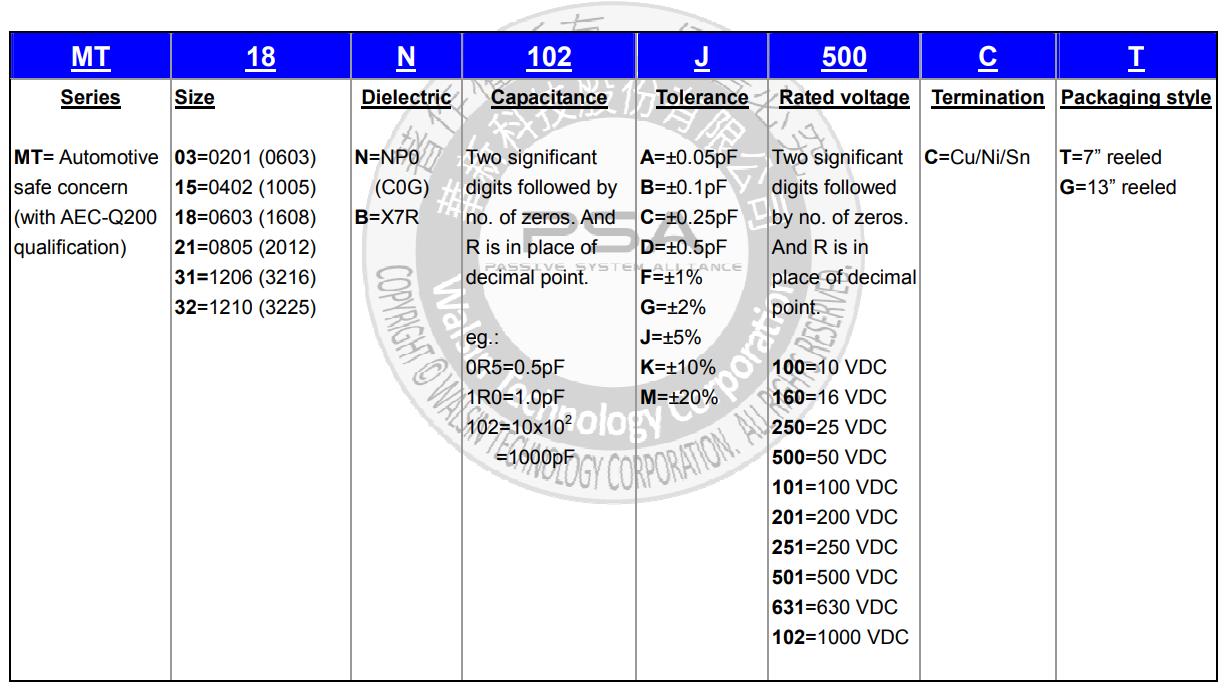 風華電容標簽規格對照表:例如風華電容型號:0805CG102500NT0805 :尺寸CG:材質102容量:1nF 500:電壓50VT:包裝方式 -編帶包裝