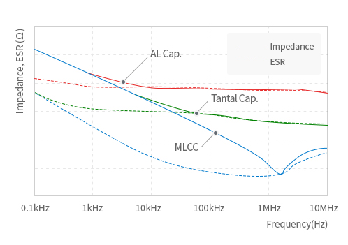 通常 MLCC的 ESR 值會根據容量有所差異。1μF 以上大容量情況下,會達到數?到數十?,如圖所示,ESR 值比 AL Cap.或 Tantal Cap. 更低。