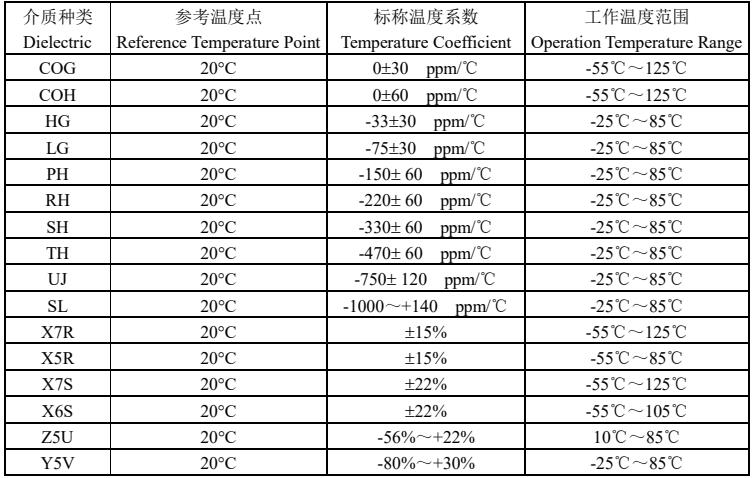 風華貼片電容介質材料溫度系數/特性 :COG 20°C 0±30 ppm/℃ -55℃~125℃COH 20°C 0±60 ppm/℃ -55℃~125℃HG 20°C -33±30 ppm/℃ -25℃~85℃LG 20°C -75±30 ppm/℃ -25℃~85℃PH 20°C -150± 60 ppm/℃ -25℃~85℃RH 20°C -220± 60 ppm/℃ -25℃~85℃SH